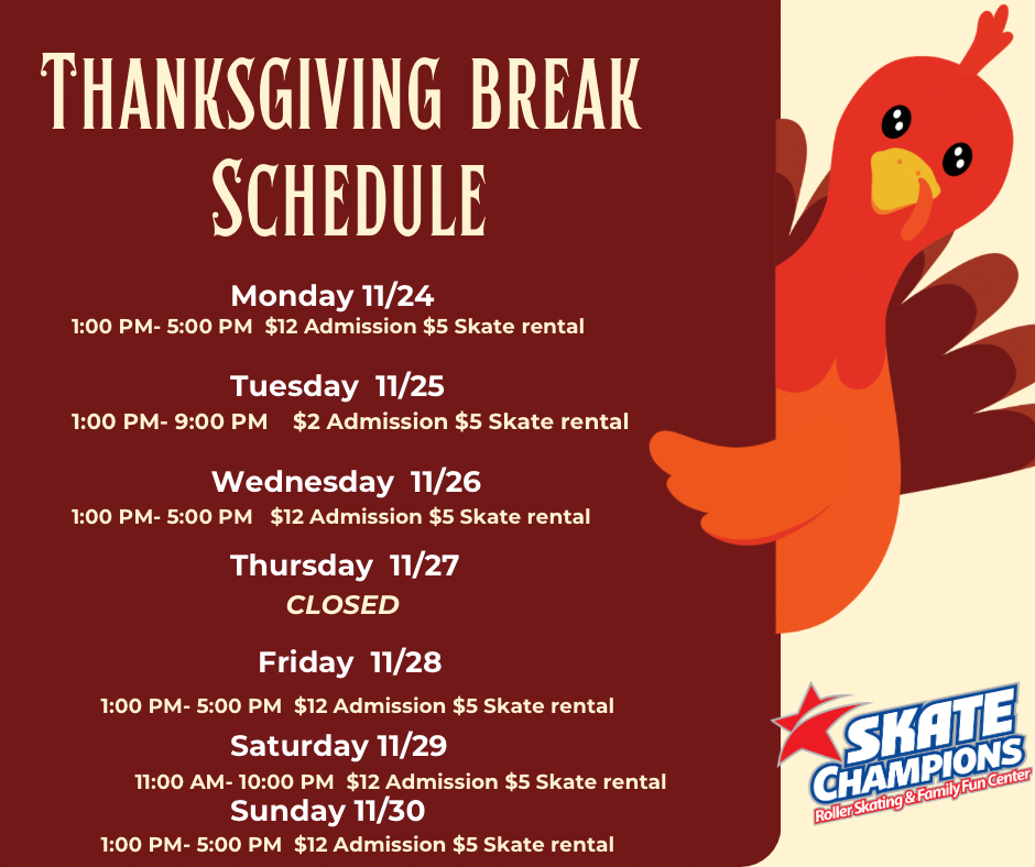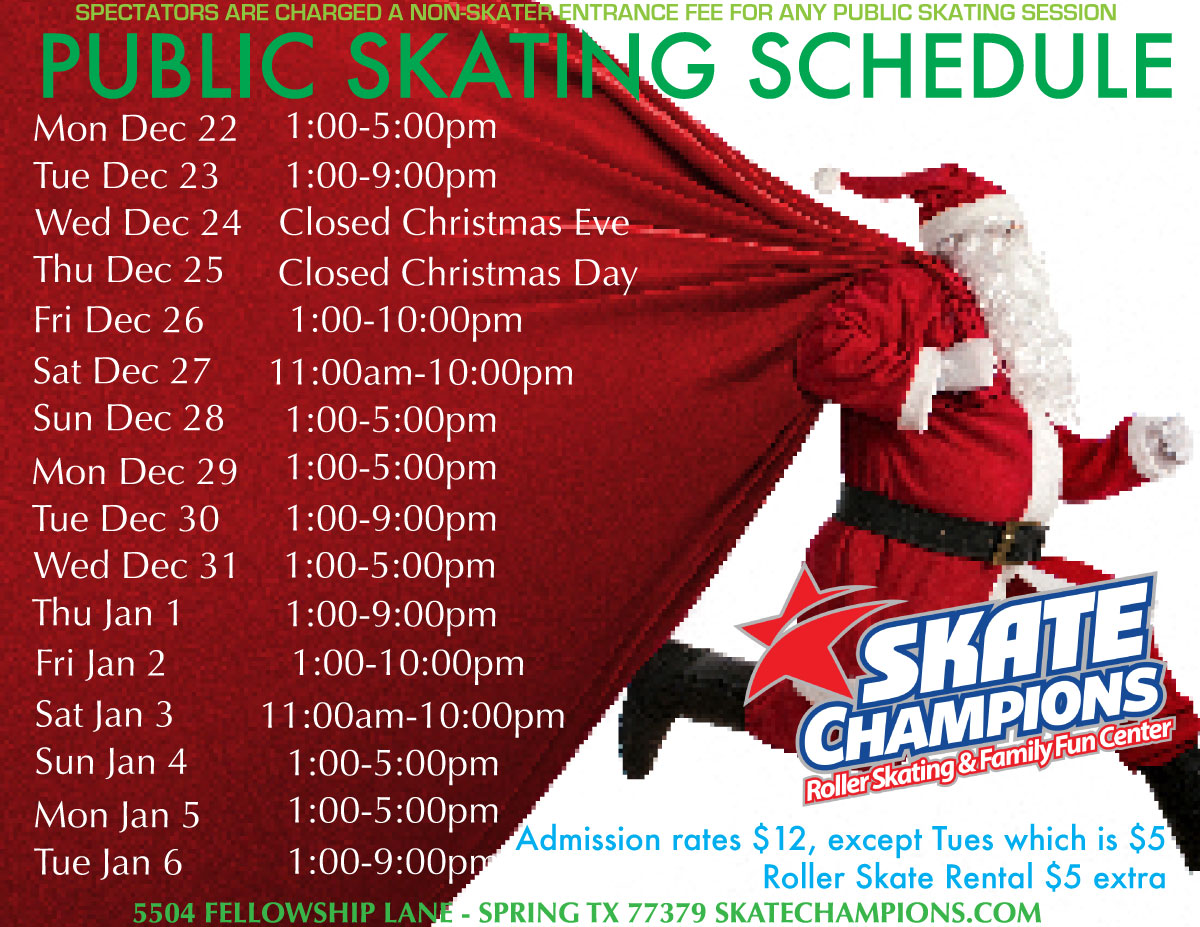 Schedule and Season Passes Beginner Skate Classes Public Skating HOurs & Prices Public Birthday Parties Spirit Night Fundraisers Click image below to expand Directions to Skate Champions Skate Champions